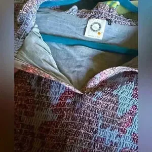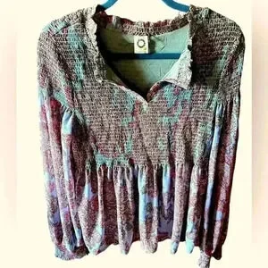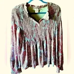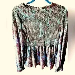 EUC sheer long sleeve smocked bodice. Robins egg blue & rosé baroque pattern. 100 % polyester chiffon fully lined in nylon. Boho vibe. Pit to pit 16.5” , length 25” in front, 26” in the back .