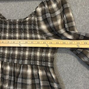 Features: Plaid, peplum, smocked, blouse, peasant sleeve