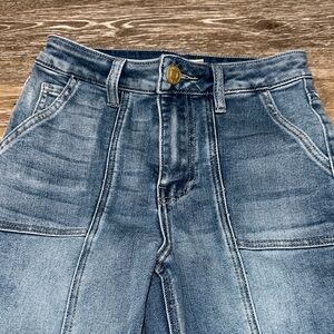 Tons of pockets! Back pockets have cute snap closure. Soft, thick denim. Excellent condition!