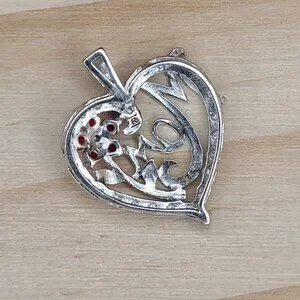 Vtg Sterling Silver Heart Pendant "Mom" Design Red Crystal Flower Accents 0.8"