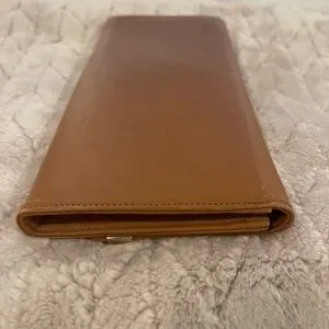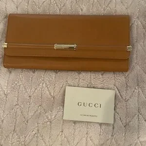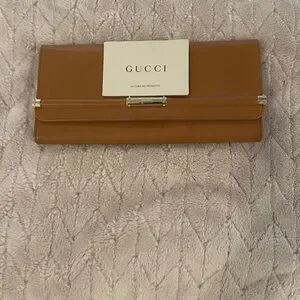 Chic Gucci wallet in tan leather. Features elegant gold details