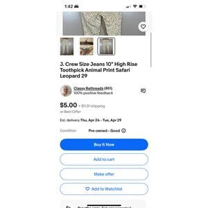 J.Crew 10" High-Rise Toothpick Jeans in Safari Leopard, Size 29.