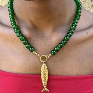 This stunning necklace features rich green beads paired with a striking gold fish pendant. Perfect for adding a touch of elegance to any outfit.
