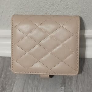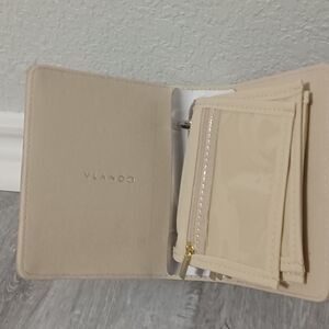 VLANDO mini travel organizer binder in tan; features gold-toned hardware, a snap closure, 3 velvet-lined zippered pouches and 2 velvet-lined pouches with 2 zippered sections