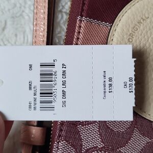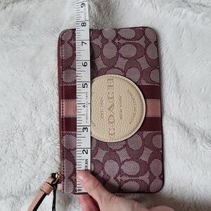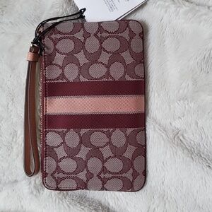 NWT! Size large; fits most phones!, signature C Logo Jacquard zippered corner wristlet in wine from Coach! Signature C all over front and back with red and pink stripes and Coach patch in the middle. Features: shell made of organic cotton and recycled polyester, pink leather wristlet strap, leather Coach patch, 2 card slots inside, and gold hardware. Show your love of Coach with this beautiful wristlet!