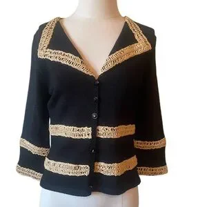 Vintage Black & gold crochet cardigan sweater 3/4 sleeves metallic unique button