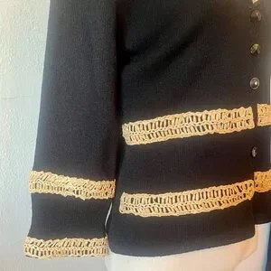 Beautiful Designer Elaris black with gold trim notched collar cardigan sweater with 2 pockets decorative trim, Size L. Vintage in Perfect condition - Pit to pit is 17” laying flat, arm length is 18” and shoulder to hem is 22 inches. Simply stunning! Free shipping. Questions? Leave a comment below! #glam #crochet #retrofashion #vintage