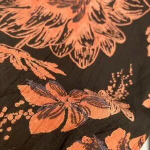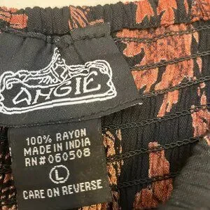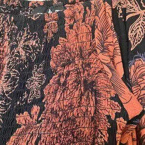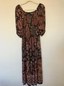 Black and rust midi-length dress by Angie. Super comfortable with stretchy smocked bodice and full, two-ruffle skirt. Size L.