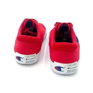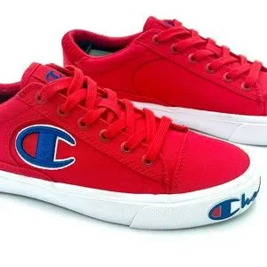Bright red sneakers with iconic Champion logo. Perfect for casual wear.
