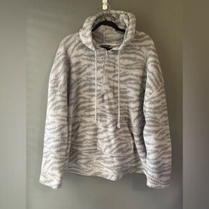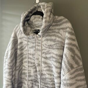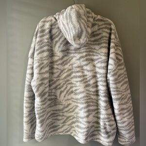 Cozy zip-up sweater with zebra pattern. Features a hood and drawstrings. Ideal for casual wear.