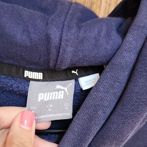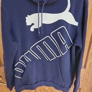 Navy hoodie featuring a bold white Puma logo. Stylish and comfortable.