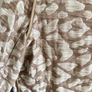 Elevated designer layering piece from Lafayette 148 New York. This luxe jacquard knit jacket features a neutral taupe and ivory animal print, a collarless neckline, exposed zip front, and zip pockets. Crafted from a high-quality cotton-viscose blend that offers structure with comfortable stretch. Perfect for work, travel, or elevated casual wear. Boxy, oversized fit. See measurements below!