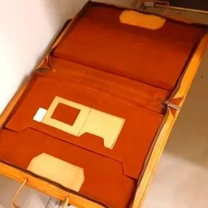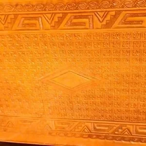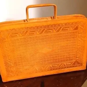 This Pymsa Mexico handcrafted genuine leather portfolio carrying case / briefcase is a stunning statement. Bright tan with two different native artwork designs engraved into the leather on each side, along with matching handles, zipper closure, and brass feet. Inside, there is plenty of storage for your documents and work-related supplies. In good, gently-used condition. Don't miss it!