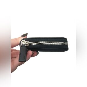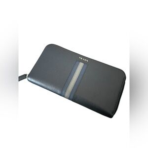 Beautiful Preloved condition large zip around wallet, safiano navy leather with grey and blue stripe accent, silver hardware and card slots and zipper compartment inside.