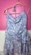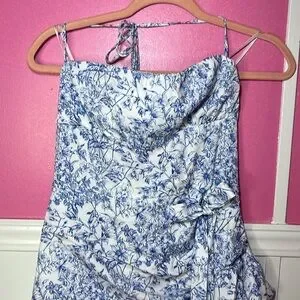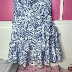 Elegant blue and white floral dress with ruffle details. Perfect for any occasion.