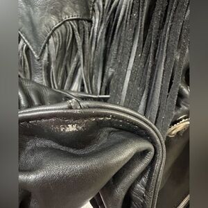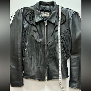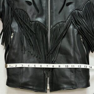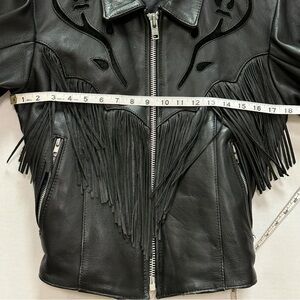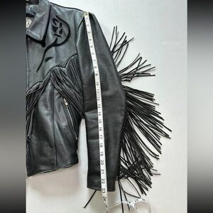 Vintage Women’s Pro-Sports Leather Moto Jacket. Made in Pakistan. Features Braided trim with Fringe across the front, across the back and sleeves. The waist is elasticized, giving that cinched, snatched look. There are silver tone conchos on the sides and rose cutouts on the front and back in a contrasting black suede adding a cool textural contrast and western vibe.