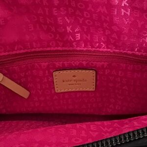 Chic black tote with tan handles. Features a gold logo plate. Ideal for everyday use.