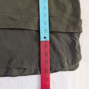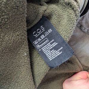 This is a pre-owned women's COS olive green mock neck sweatshirt, size L. The garment features a layered look with a longer, lighter olive green fabric peeking out from beneath the hem of the main sweatshirt. It has long sleeves and a relaxed fit. The care tag indicates machine wash cold, gentle cycle, and line dry.