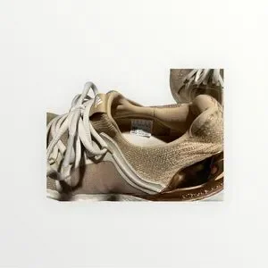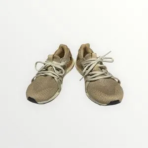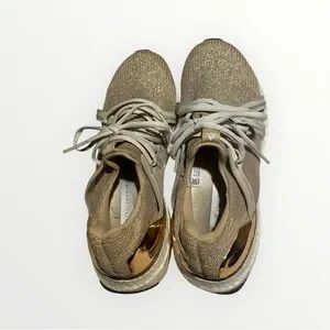 Elevated athleisure meets designer detail. These adidas x Stella McCartney UltraBoost sneakers feature a shimmering champagne-gold knit upper with a rose-gold metallic heel accent and plush Boost cushioning for all-day comfort.
