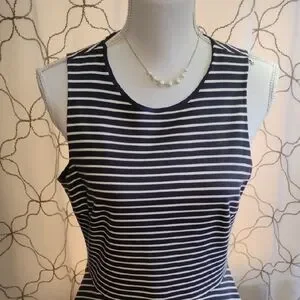 This sleeveless dress features a classic navy and white striped pattern. Perfect for any occasion, it offers a flattering fit and timeless style.knee length polyester and spandex dress