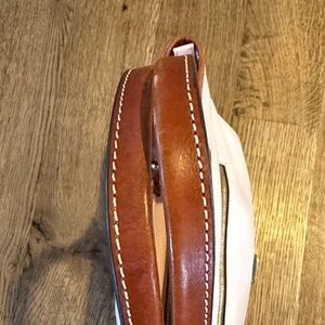 Chic light pink tote with brown leather accents. Features a front zipper pocket. Perfect for daily use.