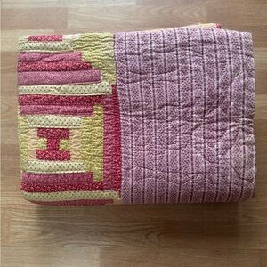 Add a pop of color to your bedroom with this vibrant pink and yellow geometric quilt. Perfect for a cozy and stylish look.