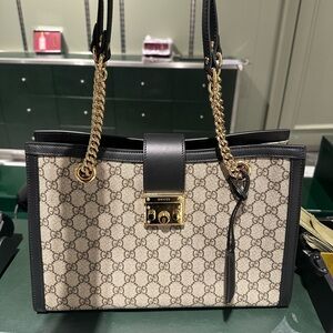 Brand New Chic Gucci shoulder bag with iconic beige pattern. Black leather trim and gold chain straps. Perfect for stylish outings.