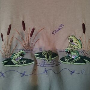 Casual green t-shirt with a playful frog graphic. Perfect for a relaxed look.