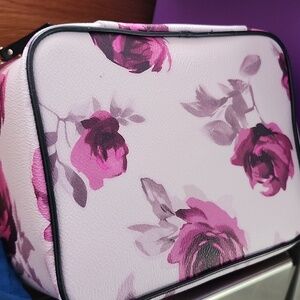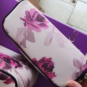 This elegant kate spade cosmetic bag set features a beautiful floral design in pink and white. Perfect for organizing your essentials with style. Comes in original box that is purple and red. Large case has zipper close with lots of room inside. Small bag zipper close.