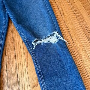 Stylish blue jeans with a distressed knee. Classic five-pocket design. Perfect for casual wear.