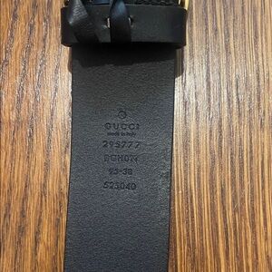 Gucci men's black leather Stylish belt featuring a unique gold and silver buckle design.