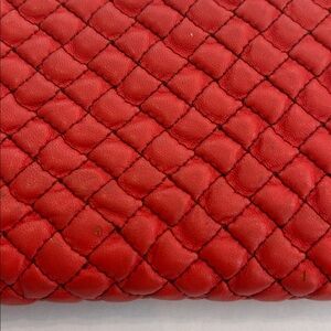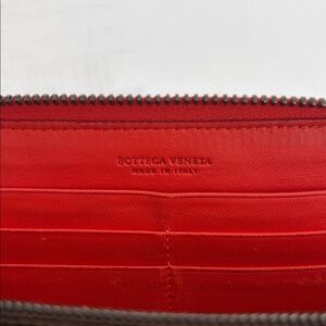 Stylish red woven wallet with a zip-around closure. Perfect for organizing essentials.