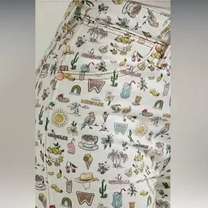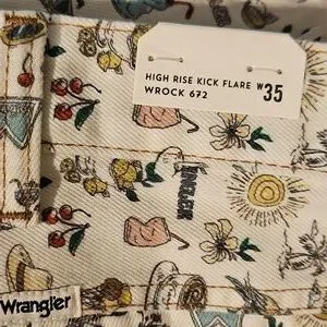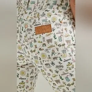 If life gives you lemons, make Wrangler's lemon-print jeans. These fun pants are decked out with sunshine, cowboy hats, and lemonade. They're 100% cotton, comfy from day one, perfect for summer. Plus, they've got that classic Wrangler hardware and patch.