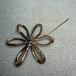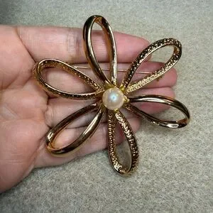 Vintage Park Lane Floral Ribbon Brooch. This brooch features a combination of smooth and textured open cut ribbon loops in the shape of a flower with a faux pearl in the middle. Gold tone metal. No stamp on the back, made around the 1970’s/1980’s. Pre owned and in very good condition for its age. Very little wear in the gold metal. Pin is in excellent working condition. The brooch has a 3 inch diameter.