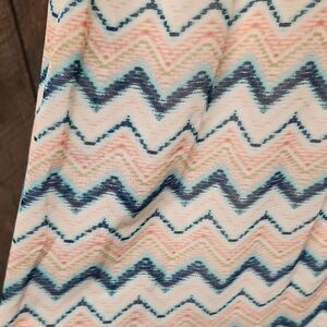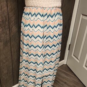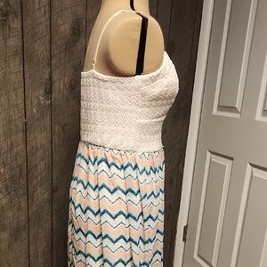 Stylish maxi dress with a cream lace bodice, has some stretch on top and padding for boobs. Features a navy blue, pink, cream, and turquoise chevron pattern on the bottom of dress. Ideal for casual outings or if you want to dress it up with a nice sweater or jewelry! wear it with a belt or as is cute either way! Has a sheer under layer so it is not see through and has a small slit in the back for air flow! Also I am 5 feet 2 inches and I could wear this with a 1 or 2 inch heal and be fine length wise for height reference! hope this helps! Conditon is lightly used. This dress is fun, light and flowy, perfect dress for Easter or any fun outing! 🐣 ✨️