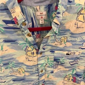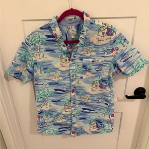 Fun and vibrant Vineyard Vines for Target tropical button-down shirt featuring a beachy island print with palm trees, boats, and coastal scenes. Lightweight 100% cotton fabric makes this perfect for summer, vacations, beach trips, or casual BBQs.