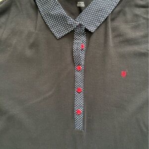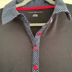 Tommy Hilfiger black T-shirt dress featuring a white dotted blue grey collar. Red button details add a pop of color. Short sleeves and above knee length. Pull over styling. Perfect for Spring and Summer.