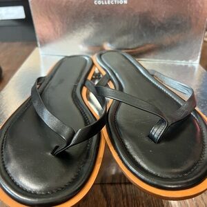 Elegant black leather sandals with a tan sole. Perfect for casual wear.