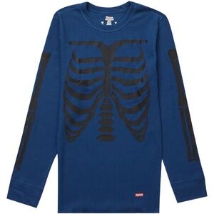 Supreme Hanes Bones Thermal Crew (1 Pack) Blue. FW23A22. Size Large. Classic Hanes waffle Blue thermal long sleeve with Black printed graphic on the front and sleeves. Supreme logo on the bottom lower front. 60% Cotton, 40% Polyester. Unopened in original packing.