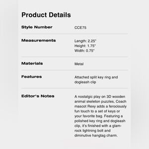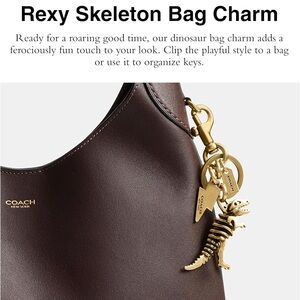 “A nostalgic play on 3D wooden animal skeleton puzzles, Coach mascot Rexy adds a ferociously fun touch to a set of keys or your favorite bag. Featuring a polished key ring and dogleash clip, it’s finished with a glam-rock lightning bolt and diminutive hangtag charm.” -Coach