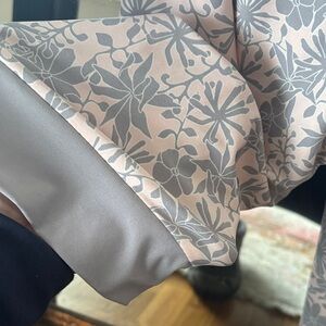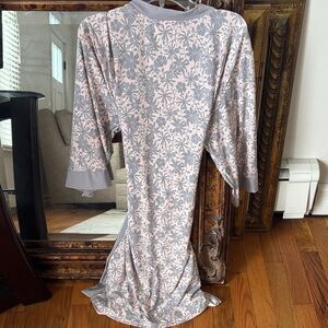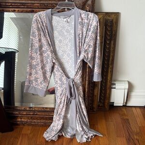 Lightweight gray and pale pink robe with tie. robe has a floral pattern. Length is Just above knee and arm length is 3/4. Worn once, no defects.