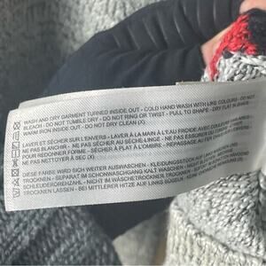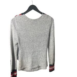 Grey marled knit sweater with navy and red crossover stripe detailing, by C/Meo Collective.