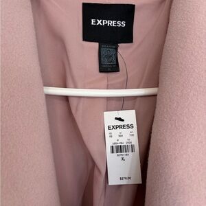 Elegant pink trench coat by Express. Features a wide collar and tie belt. Perfect for stylish layering.