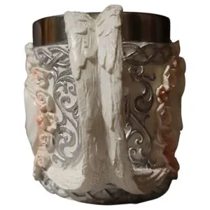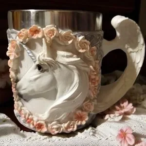 • This beautiful unicorn mug is very ideal for bridal, valentine's, medieval, and other enchanted themed parties/events. It will also be a great decor for your home as well as a functional mug for your day to day use! • A romantic white unicorn graces the surface of the mug on both sides, surrounded by pink rose laurel. The mug is filled with celtic knotwork and scroll art to complete the romantic feminine theme. The mug is equipped with an inner cup liner made of stainless steel for safe drinking, and the handle is sculpted like an angel's wing. Simply gorgeous!