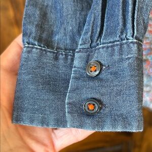 Beautiful denim button-down blouse by anthropology. She is a high low US size 4 EU size 36.