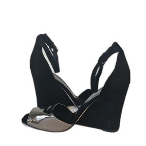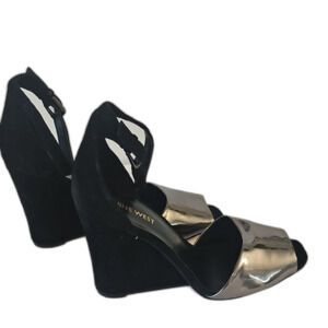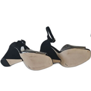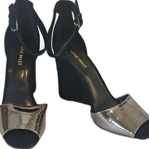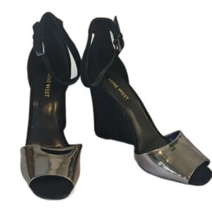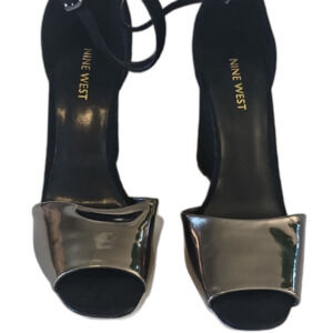 These sophisticated Nine West heels feature a sleek black design with a striking silver accent at the toe. The stiletto heel and delicate ankle straps add a touch of elegance, making them perfect for formal occasions. Elevate your style with this chic and versatile pair. New Without Tag.