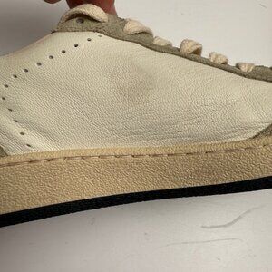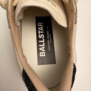 Description: These gorgeous Golden Goose Ball Star sneakers have an American college vibe caught between a hoop shot and a skateboard ride. A white nappa leather upper features a black glitter star and heel tab. The dove-gray suede inserts and cream laces add the finishing touch. They have a natural worn in look but in excellent condition.