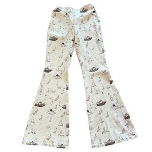 These flare leg pants feature allover Western illustrations including cowboy hats, boots, cacti, and rodeo horse riders.