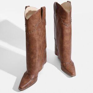 Women's Brown Shark Boots Fold Over Mid Calf Chunky Heel Snip Toe Cowboy