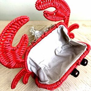Make a bold statement with this unique red crab-shaped woven bag. Perfect for adding a playful touch to any outfit.